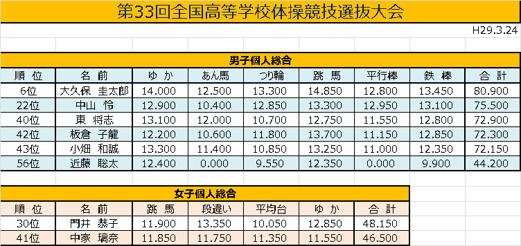 平成29年3月24日に行われた、第33回全高等学校選抜大会の結果です。
