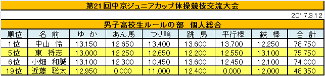 2017年3月12日に行われた第21回中京ジュニアカップ体操競技交流大会の結果です。